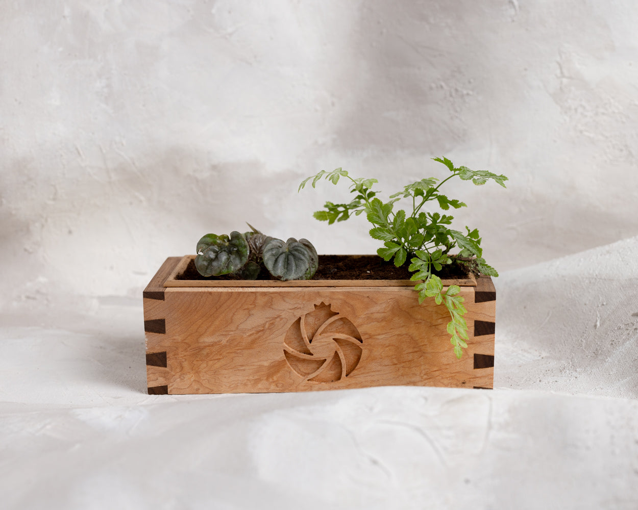This is a sub-irrigated (self-watering) planter that uses capillary action to reuse and recycle water retained in the attached drip tray. The planter uses hand cut dovetail joints in walnut and maple to show their natural contrast. Everything is designed and built custom to work together beautifully. It features a customized liner that connects to a drip tray using magnets.